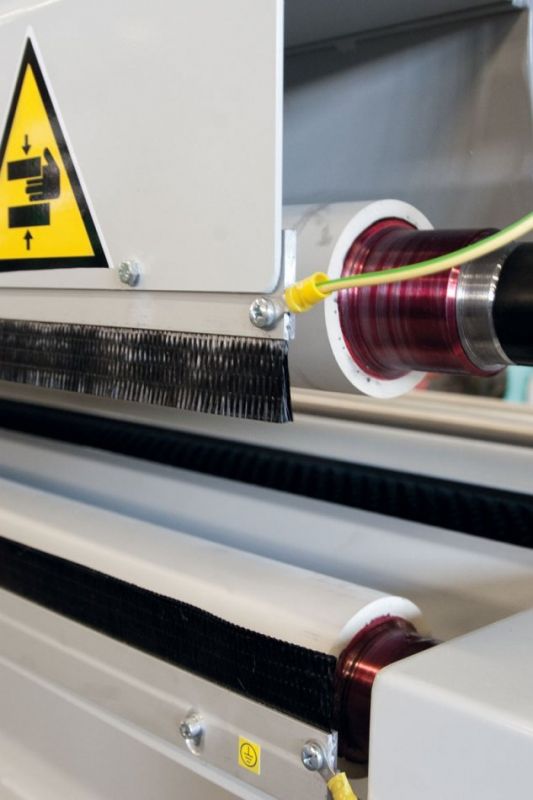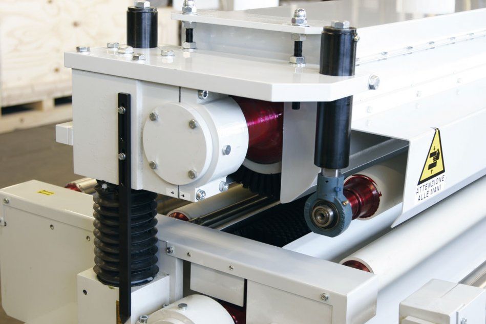 Konstrukcja urządzenia zaprojektowana specjalnie dla płyt wielkogabarytowych do 2200 mm szerokości; inne niestandardowe wymiary mogą zostać zaprojektowane na życzenie klienta. Wymiana szczotek jest łatwa, gdyż rolka zamocowana jest na wspornikach dzielonych połowicznie, z niezależnymi napędami dla rolek szczotkarskich, jak i samej maszyny.