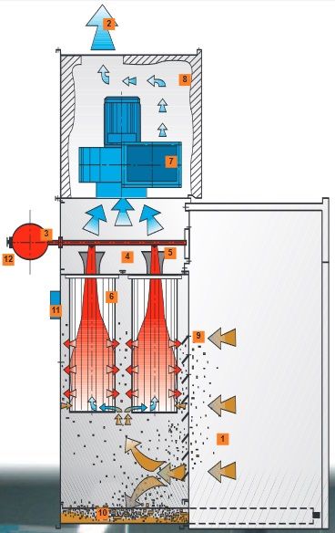 Procedura działania ściany/kabiny wyciągowej jest prosta i skuteczna (patrz rysunek). Urządzenie wytwarza próżnię za pomocą wygłuszonego wentylatora odśrodkowego zamontowanego na dachu kabiny. Podciśnienie to wymusza cyrkulację przepływu powietrza wyłącznie przez filtry wkładowe. Powietrze jest doskonale oczyszczane i uwalniane za pomocą wentylator odśrodkowy cechującego się, wysoką prędkością ssania, zgodną z obowiązującymi normami i przepisami. Kabina wyposażona jest w kompletny cykliczny programator czyszczenia wkładów filtracyjnych za pomocą sprężonego powietrza.