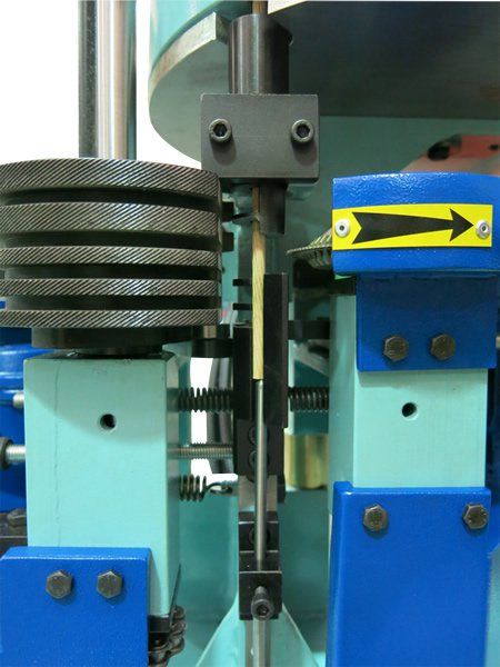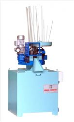 Automatyczna maszyna cięcia przekrojowego, dla prostopadłego cięcia i fazowania górnego-dolnego rowkowanych oraz zwykłych drewnianych kijów do produkcji kołków o długości 20 - 100 mm oraz o zakresach średnicy 6 - 18 mm.