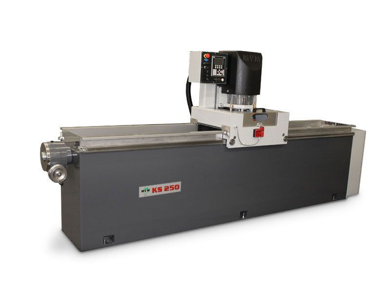 Ostrzarka noży KS 250 dostępna jest w różnym zakresie długości roboczej - od 1500 mm do 7100 mm oraz większym, zgodnie z wymaganiami klienta. Podstawa maszyny została wzmocniona dla wymagającej obróbki oraz zapewniania maksymalnej stabilności. W pełni osłonięte prowadnice górne oraz boczne w standardzie. KS 250 składa się z sterownika PLC, umożliwiającego kompletną kontrolę nad programami szlifierskimi oraz ruchami wózka głowicy podczas różnych etapów cyklu obróbczego. Maszyny jest odpowiednia dla szlifowania szerokiego zakresy prostych noży przemysłowych, takich jak noże rębakowe, ostrza granulujące, noże obierające do forniru, noży gilotynowych oraz noży papierniczych.